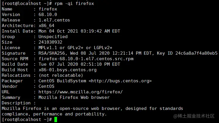rpm -qi <软件包名>: 查询软件包信息rpm -qi firefox