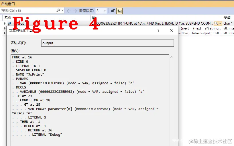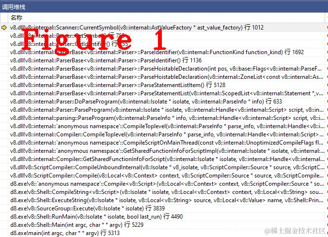 调试程序是最有效的验证手段,从代码的角度验证上述结论是否正确, 请读者跟踪ParseFunctionLiteral()方法,并查看is_lazy和is_top_level成员的值,看到这两个成员的值为真,上述结论正确无误,图3给出ParseFunctionLiteral()的调用堆栈,便于读者复现代码执行过程。