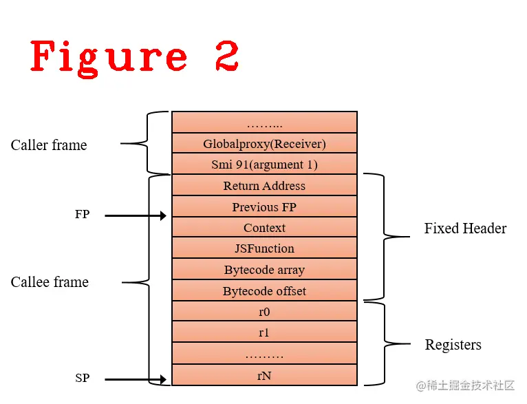 这种编码其实是stack frame的偏移量,见图2,fa补码(two’s complement)是6,FP减6正好是r1寄存器,a0补码是2,FP加2正好是第一个实参91。这种编码方式的优点:通过简单的FP加减操作,实现了对参数和寄存器的快速访问,简化了字节码的设计。注意: 由于v8版本更新迭代快,不同版v8的编码实现存在细微差别,但编码思路是相同的,并且v8中规定了寄器存访问公式:r[i]=FP-2-kFixedFrameHeaderSize-i,参数访问公式:a[i]=FP+2+parameter_count-i-1,parameter_count表示参数的数量。