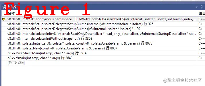 上述代码中,可以看到从code的角度对Builtin进行了更详细的分类。另外code是堆对象,也就是说Builtin是由V8的堆栈进行管理,后续讲到堆栈时再详细说明这部分知识。图2给出函数调用堆栈,供读者自行复现。