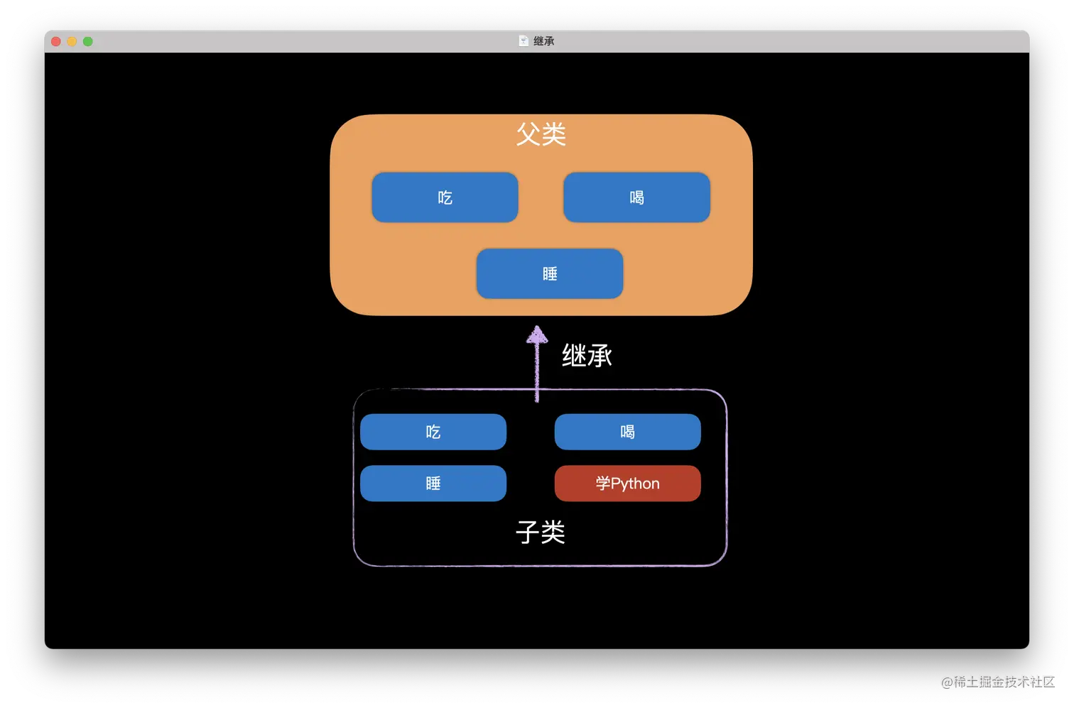 继承是一种创建新类的方式,如果子类需要复用父类的属性或者方法时,就可以使用继承。当然,子类也可以提供自己的属性和方法。
