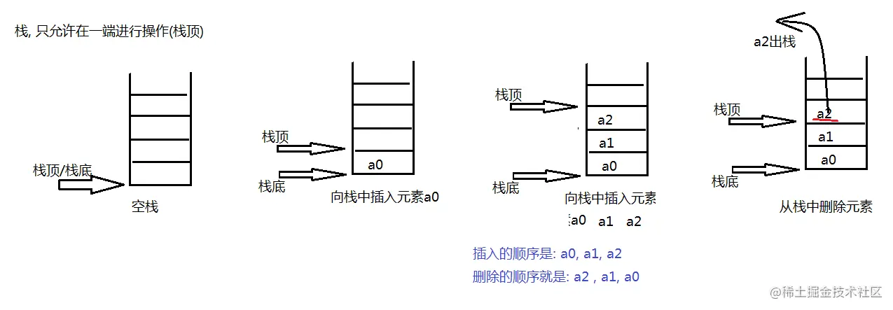 假设有栈S={a1,a2,a3,…,an},那么最后加入栈中的元素an被称为栈顶。进栈按照顺序a1,a2,…,an,出栈则按照an,an-1,…a1。若an-1需要出栈,则必须先将an出栈才可以。换句话说,这个一个后进先出(LIFO,Last In First Out)的线性表。