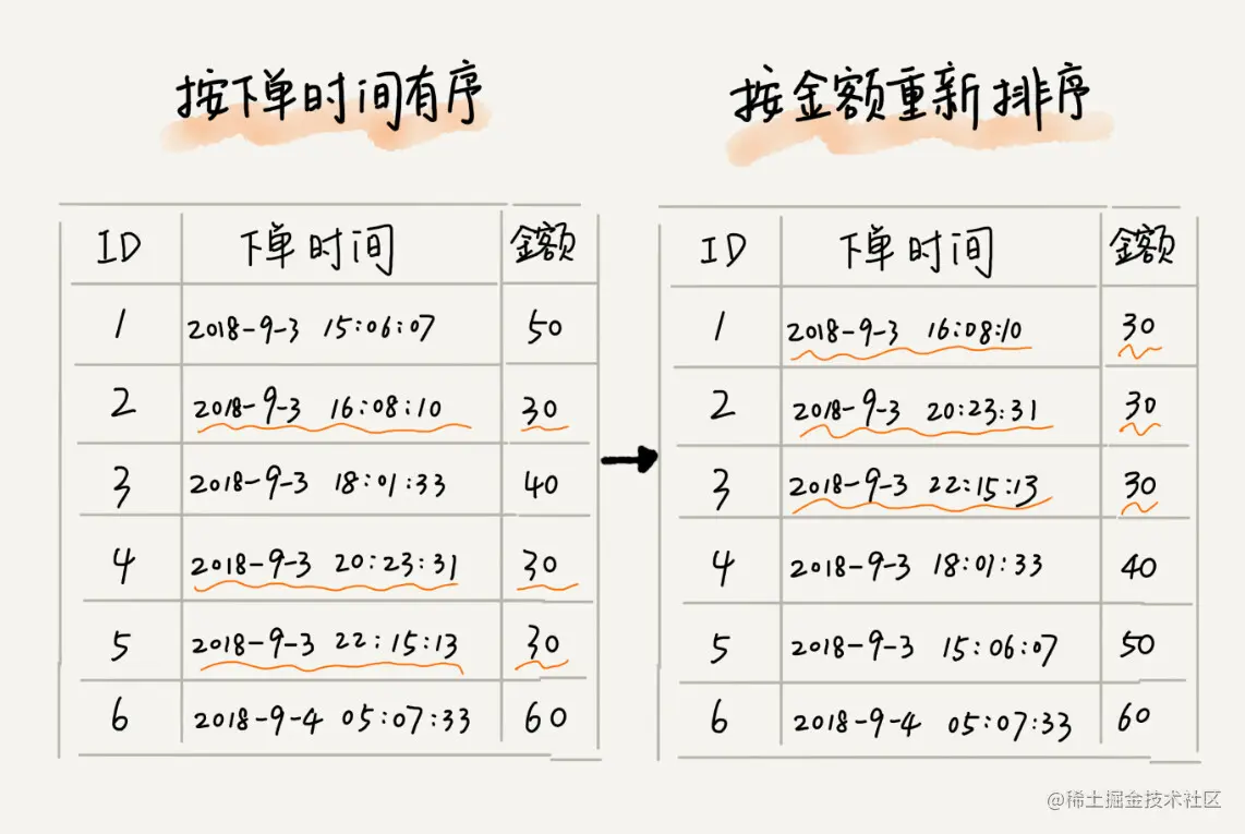 - 在时间有序的情况下,排序金额,如果算法不稳定,则会导致时间无序