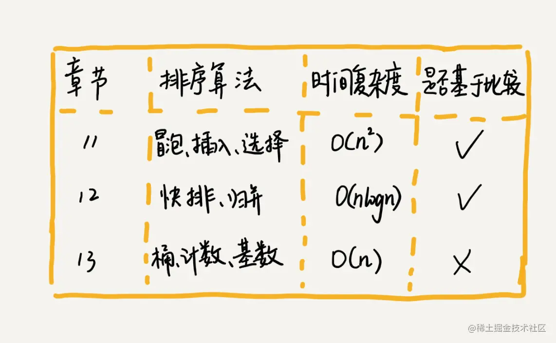 - 原地排序:空间复杂度为O(1) 的排序算法