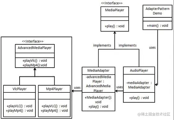 我们想要让 AudioPlayer 播放其他格式的音频文件。为了实现这个功能,我们需要创建一个实现了 MediaPlayer 接口的适配器类 MediaAdapter,并使用 AdvancedMediaPlayer 对象来播放所需的格式。