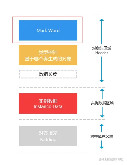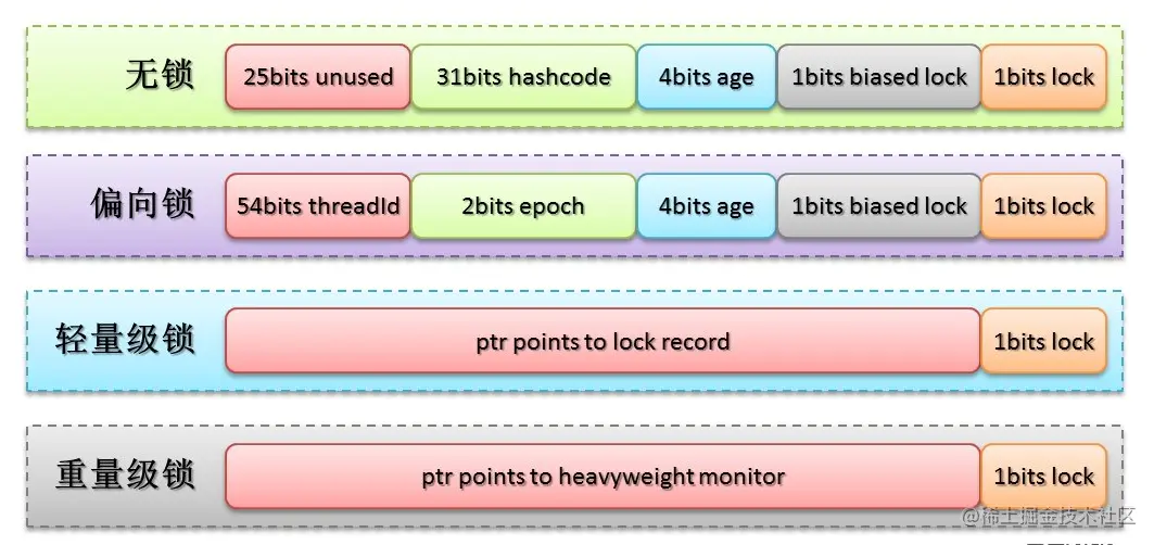 这些锁存储在哪个位置呢?对象头中。Java的每个对象,在JVM中的结构如图。Mark Word区域就是对象头。展开来就是上图的样子
