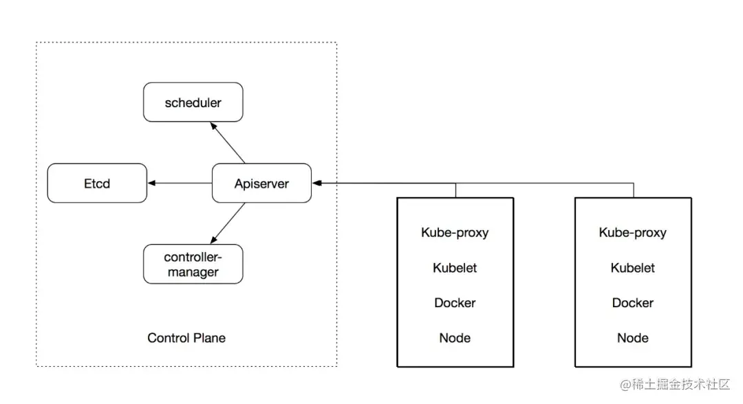 我们看下 k8s 集群的架构,从左到右,分为两部分,第一部分是 Master 节点(也就是图中的 Control Plane),第二部分是 Node 节点。