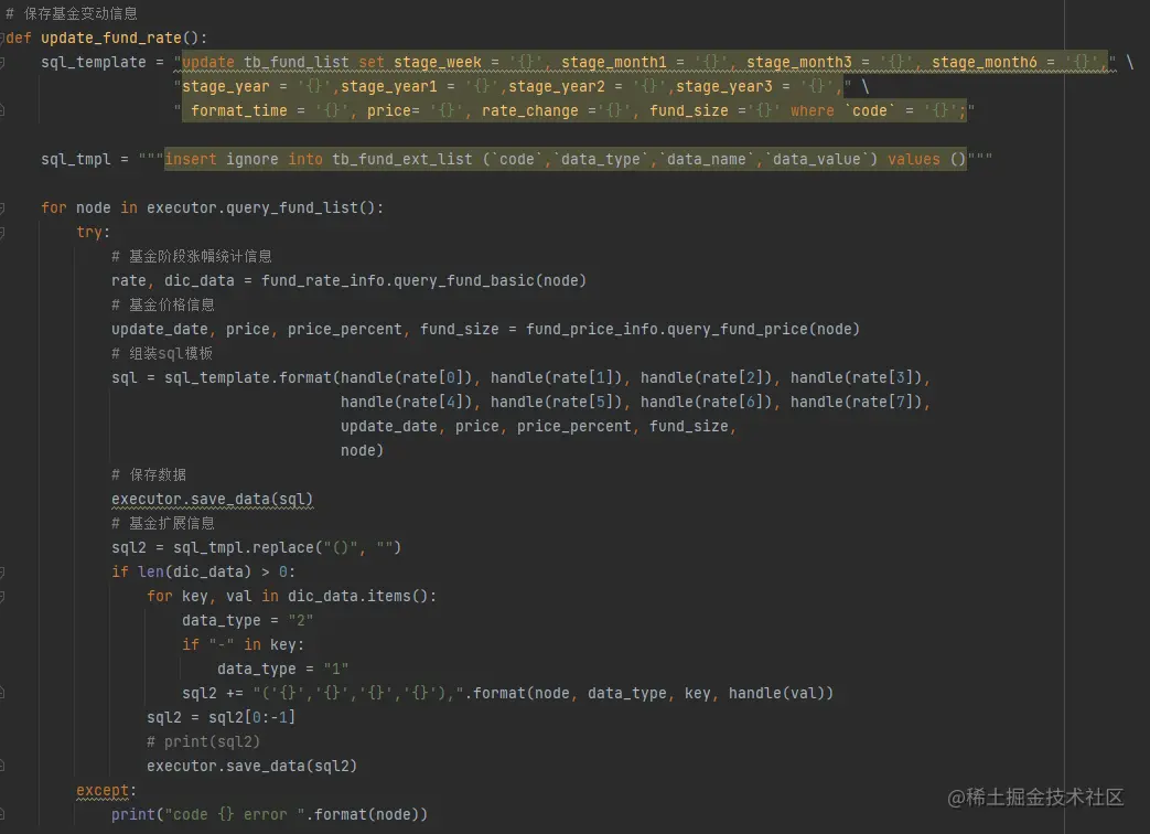在这里获取基金信息包括两个部分,一部分是场外基金另外一部分是场外基金信息。之在前的文章中,我们已经获完成了场外基金和ETF基金信息的代码,因此在这里我们仅仅需要存储数据库即可,那么有个问题,基金的信息是随时发生变更的或者更新的。在保存时需要先判断基金代码是否已经存在,如果存在则更新,如果不存在则新增,但是这样效率有点低,这时候就用到之前的文章内容,使用这样 on duplicate key update 的语句就可以一条sql搞定了。举例如下所示: