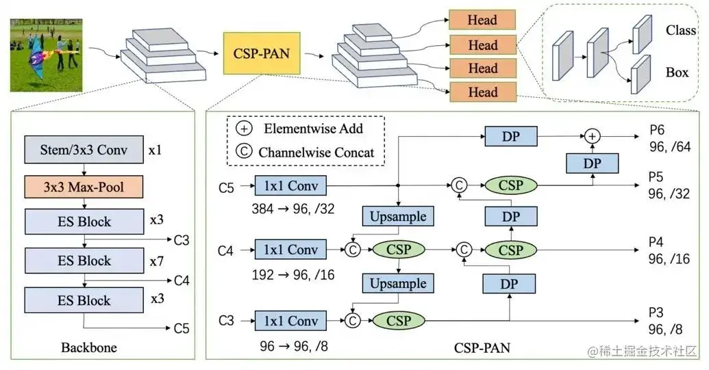 在Neck部分,PP-PicoDet提出了CSP-PAN结构,使用1*1的卷积将特征的通道数与BackBone输出的最小通道数进行统一,从而减少计算量,并保证特征融合性能不受影响。此外,PP-PicoDet还在CSP-PAN的基础上再下采样一次,添加一个更小的特征尺度来提升大物体的检测效果(见下图P6分支)。