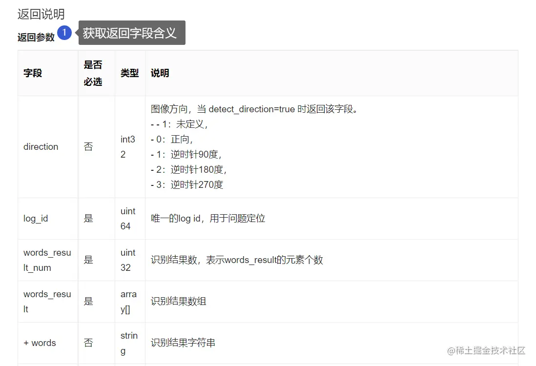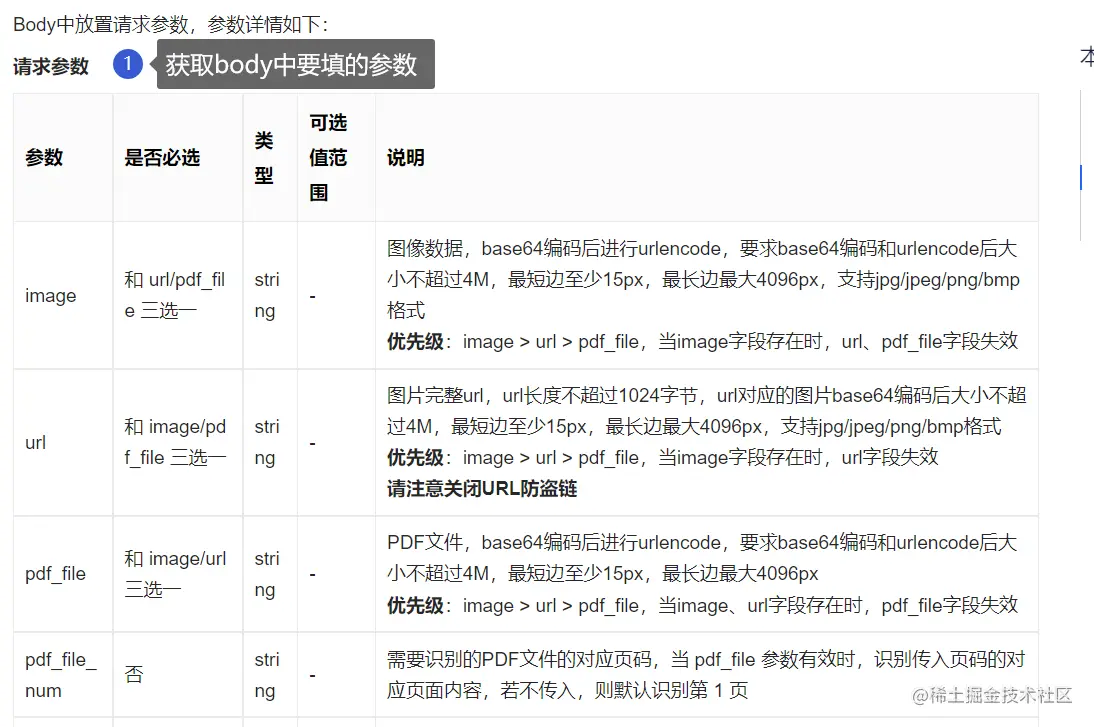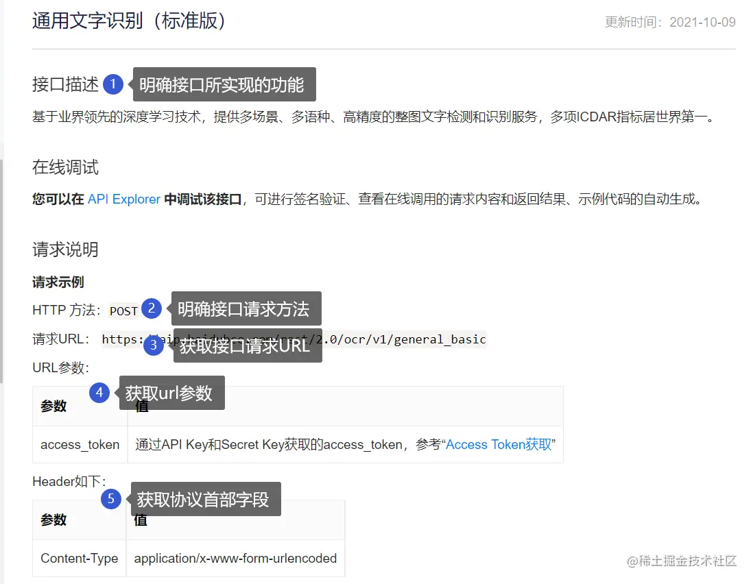 以百度开放API,文字识别接口为例:我们想要使用它的文本识别功能,需要去调用它的接口,那么需要了解发起这个文本识别接口请求,每个字段需要填什么内容。