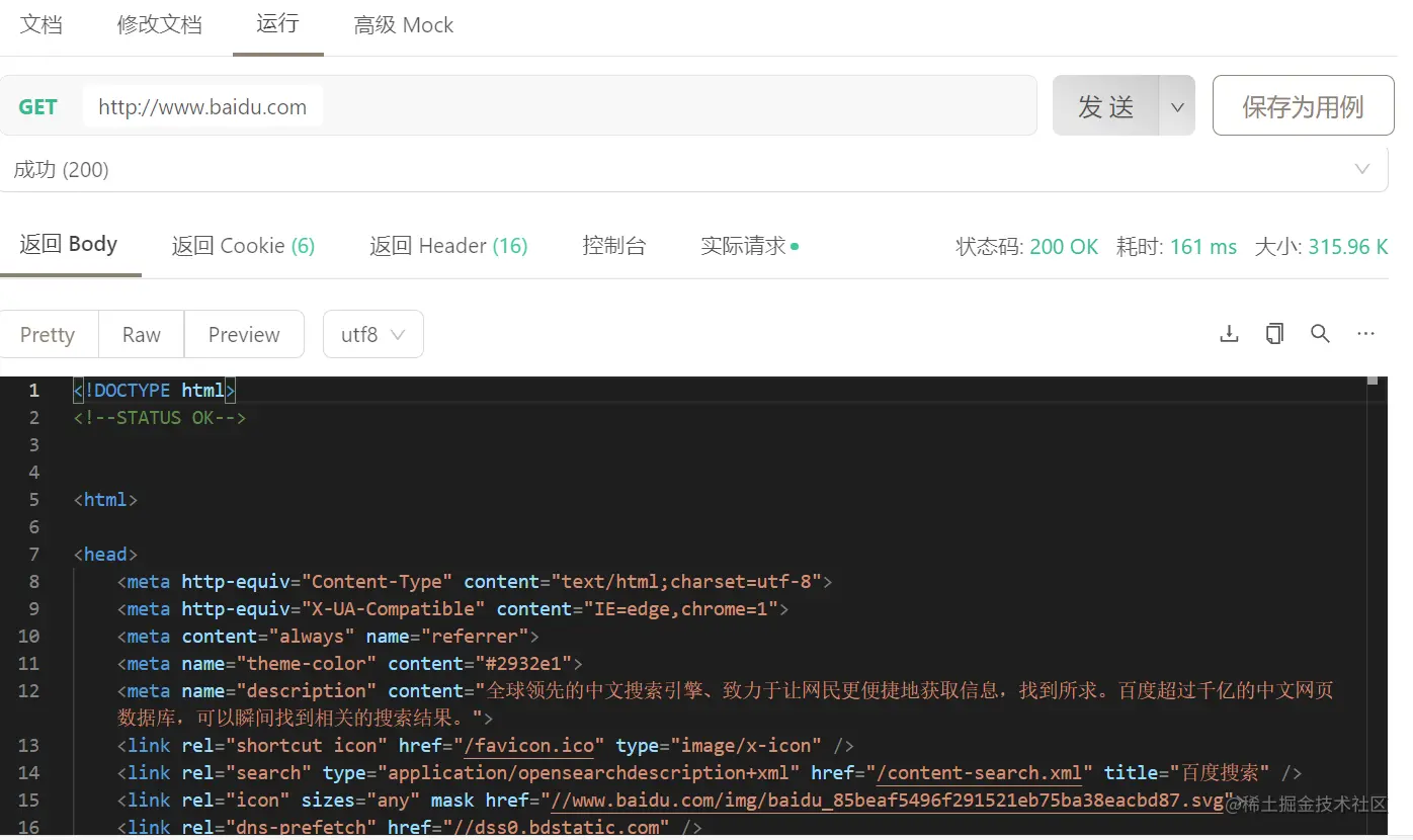 step1:在apifox的新建接口tab输入“www.baidu.com”,请求方法选择GET,header参数,url参数,body参数均为空,接着点击send按钮。 step2:查看返回值,可以看到请求回来的数据是一个html页面,即百度首页,我们点击‘preview’按钮,可以看到一个完整的页面显示出来