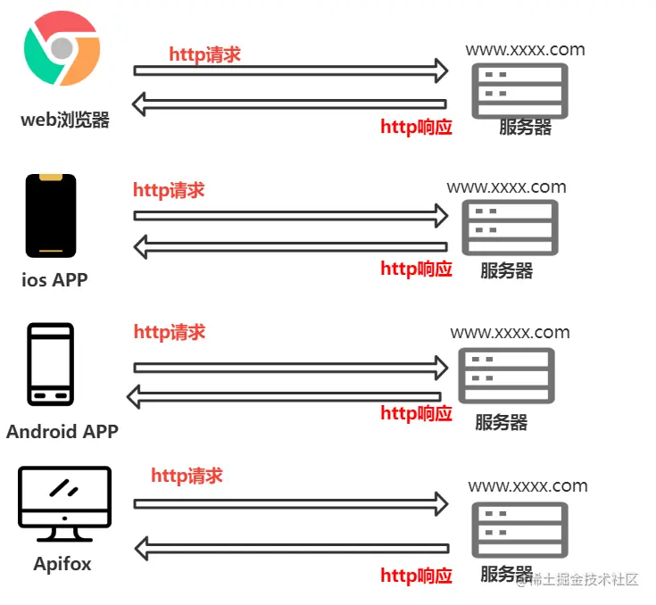 对于服务器来说,Apifox也是一个前端,只不过其他前端的接口请求由研发人员在代码里封装好,在特定条件下被触发发起请求,而Apifox中,接口请求由用户手动封装,手动发起。