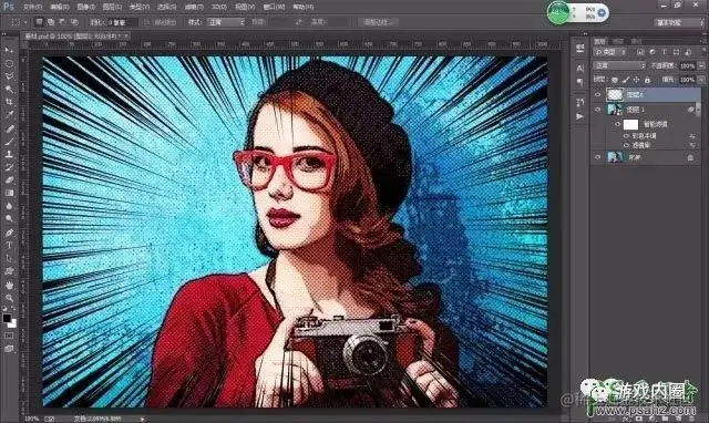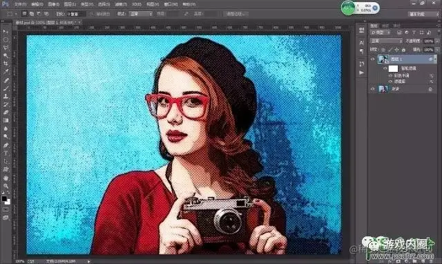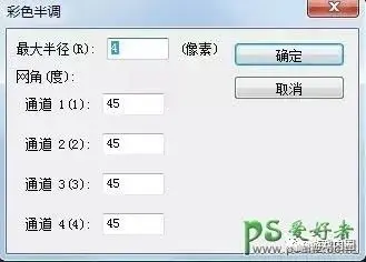 3、执行滤镜-像素化-彩色半调,作用是模拟原点效果。半调值在此处是是4-127,如果数值越大,则圆点会变得越大,通道的数值自己设定,此处设置成45度。