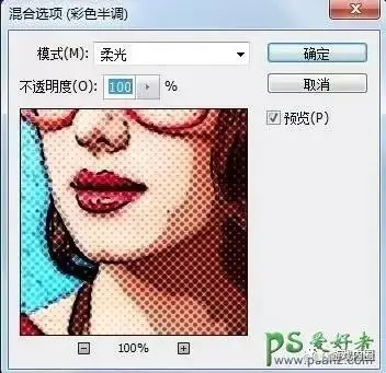 4、点击彩色半调后面的这个按钮,然后开始修改混合模式和不透明度,将彩色半调的混合模式改为柔光。