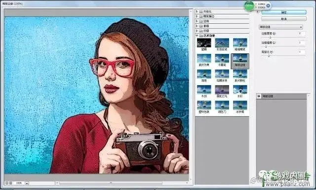 2、执行滤镜-滤镜库-艺术效果-海报边缘。其中的数值根据自身的爱好选择。