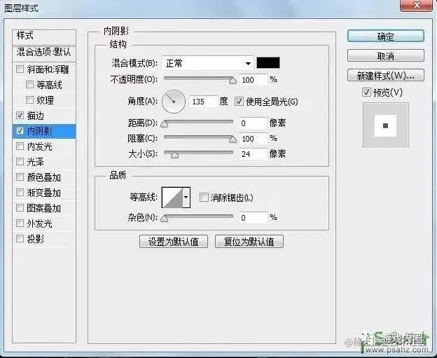 10、内阴影,颜色可以选择黑色,不透明度则选择100%,距离此处设置成0,扩展到100,大小设置一下,让黑色边展示出来一点点即可。
