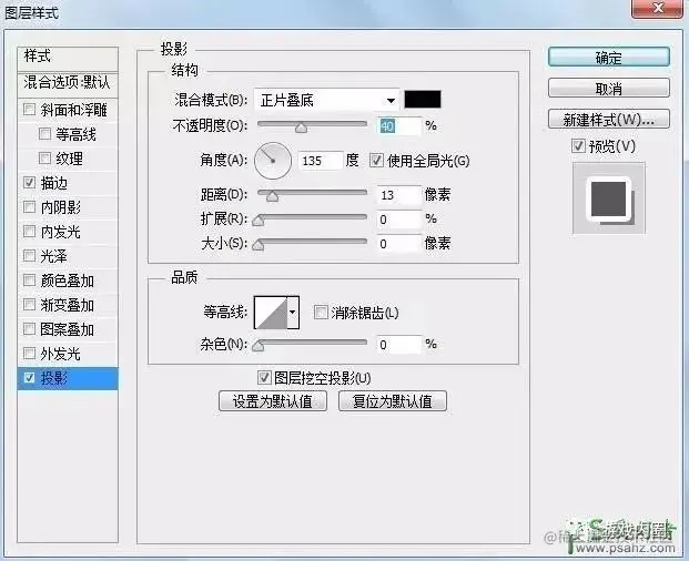 投影:不透明度降低一些,光线角度给到左上角位置,此处设置成135,距离大一些,大小的扩展都是0。