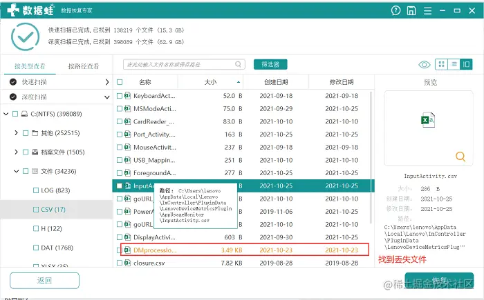 第二步:数据蛙数据恢复专家软件具有双重扫描模式,在开始界面点击右下角的扫描之后就会进入快速扫描模式,就可以扫描出很多丢失的文件。完成快速扫描后,单击右上角的深度扫描,就可以扫描出更多的文件。悬浮光标在文件名称上,可以看到文件的具体信息,例如文件大小、创建日期、全称。右上角的图标,也可以看到这些信息,还可以对文件进行预览。