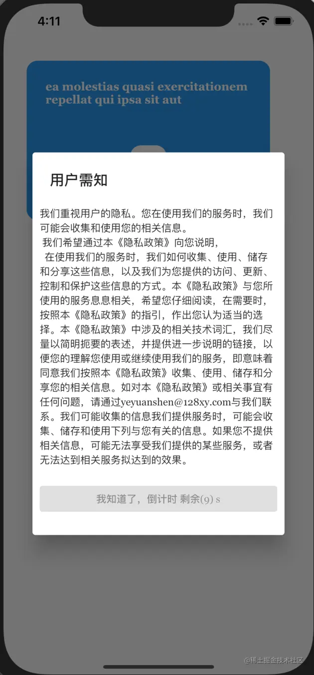 ``` /** author:mac 创建日期:2021/11/23 描述: */import 'dart:async';import 'package:flutter/material.dart';import 'package:get/get.dart';class AuthDialogController extends GetxController { RxInt count = RxInt(10); var text = '我们重视用户的隐私。您在使用我们的服务时,我们可能会收集和使用您的相关信息。\n 我们希望通过本《隐私政策》向您说明,\n 在使用我们的服务时,我们如何收集、使用、储存和分享这些信息,以及我们为您提供的访问、更新、控制和保护这些信息的方式。本《隐私政策》与您所使用的服务息息相关,希望您仔细阅读,在需要时,按照本《隐私政策》的指引,作出您认为适当的选择。本《隐私政策》中涉及的相关技术词汇,我们尽量以简明扼要的表述,并提供进一步说明的链接,以便您的理解您使用或继续使用我们的服务,即意味着同意我们按照本《隐私政策》收集、使用、储存和分享您的相关信息。如对本《隐私政策》或相关事宜有任何问题,请通过yeyuanshen@128xy.com与我们联系。我们可能收集的信息我们提供服务时,可能会收集、储存和使用下列与您有关的信息。如果您不提供相关信息,可能无法享受我们提供的某些服务,或者无法达到相关服务拟达到的效果。'; Timer _timer; init() { print('init $count'); count.value = 10; _timer = Timer.periodic(Duration(milliseconds: 1000), (timer) { if (count.value >= 1) { count.value -= 1; } else { // 倒计时结束 print('倒计时结束了'); _timer.cancel(); } }); } dismiss(BuildContext context) { Navigator.of(context).pop(); } @override void dispose() { Get.delete<AuthDialogController>(); _timer.cancel(); super.dispose(); }}```
