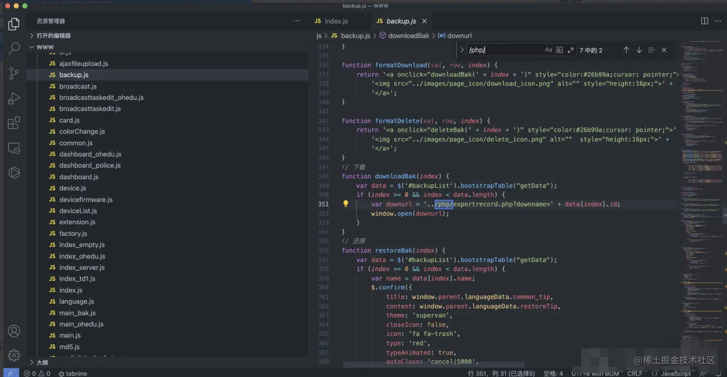 之前爆破到了 php目录,猜测为功能性文件,我们可以通过 js文件中的信息获取一些文件名和接口信息