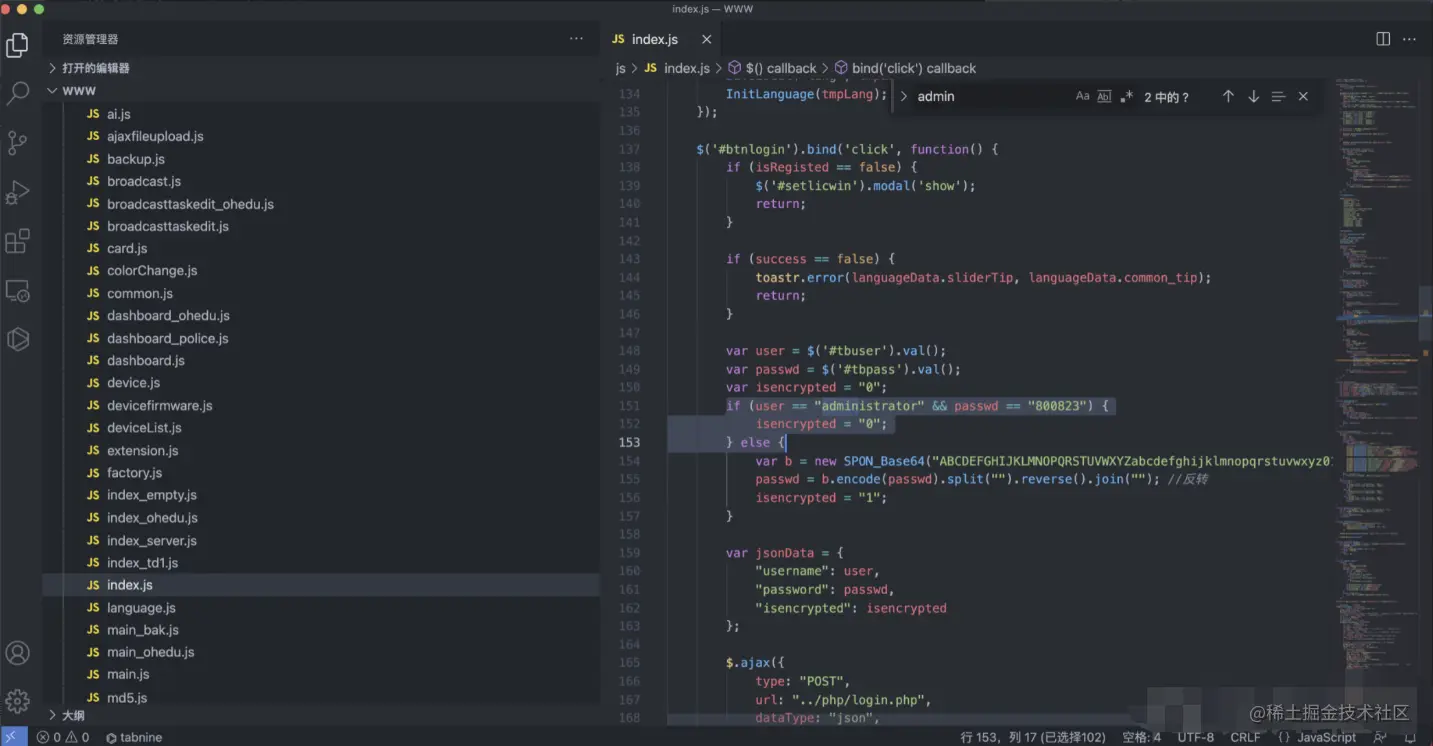 获取后通过爬虫遍历 JS文件下载到本地翻阅,其中发现 /js/index.js 文件中有敏感信息,猜想可能是后门账号或者默认密码