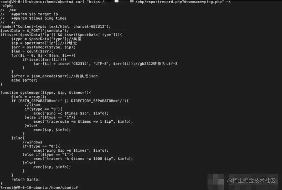 这里可以看到这里接收的参数 jsondata数组中的 ip参数,用户可控造成命令拼接,而且通过 exec 执行,并且会 return到页面中,导致回显的RCE
