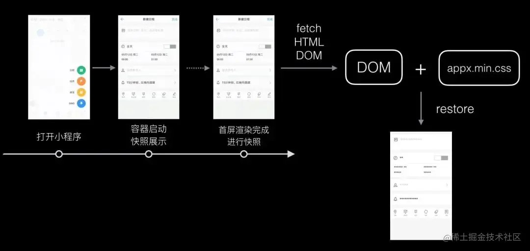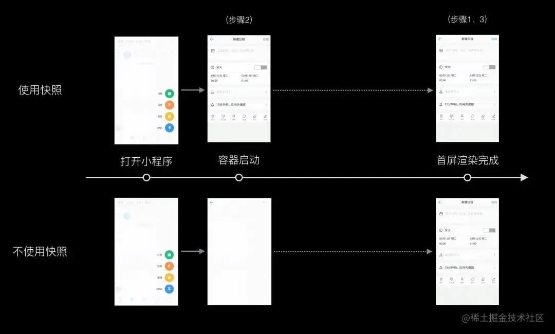 - 步骤2:下次打开小程序时先展示上次保存的快照,再启动小程序