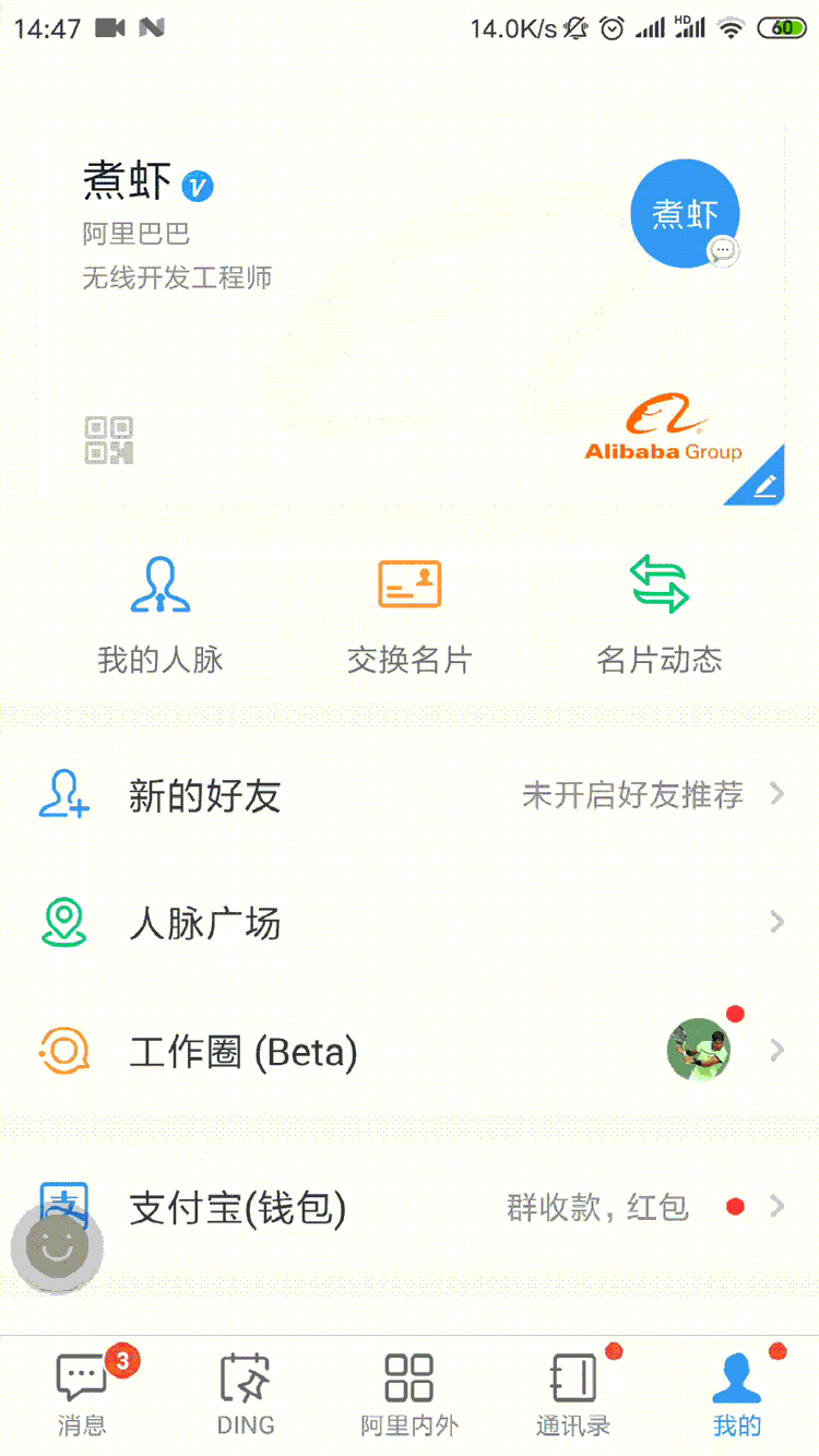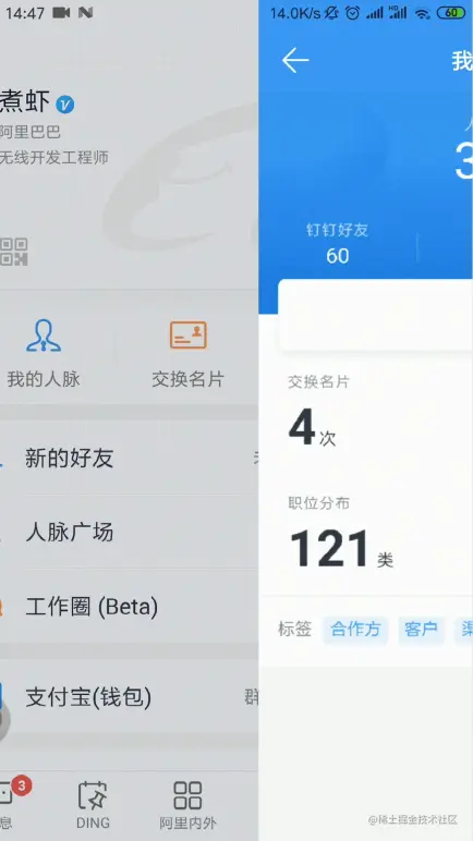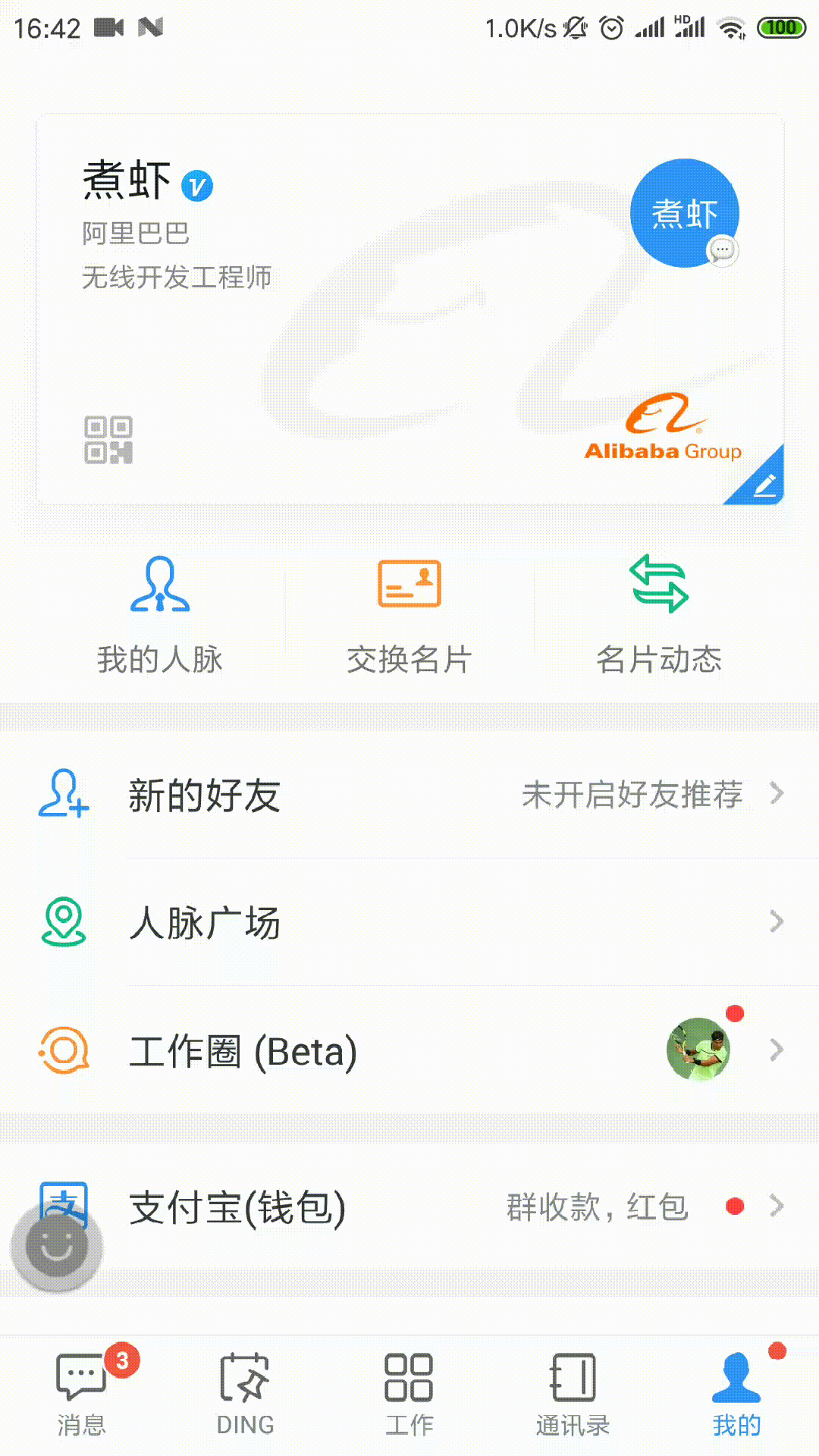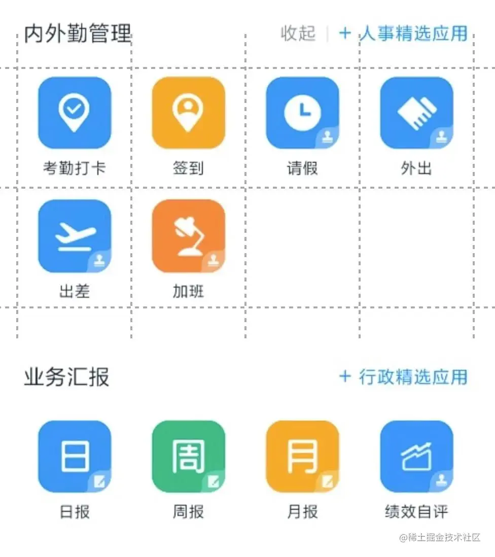 为进一步提高快照层的可交互性,我们甚至还可以允许开发者设定一些快照层的点击区域和简单操作,使用户在点击快照层的时候快速响应点击事件。例如钉钉的工作台就非常适合这种场景:工作台中的各个应用一般不会频繁变化,并且有很明确的分块区域: