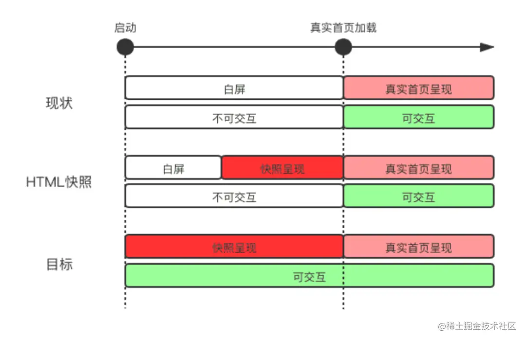理想中的快照,应当是能够和首屏页面完全重合,并且在快照隐藏时不会产生任何视觉变化的。那么生成快照的时机和运用快照的场景就直接决定了快照技术能够达到的优化效果。