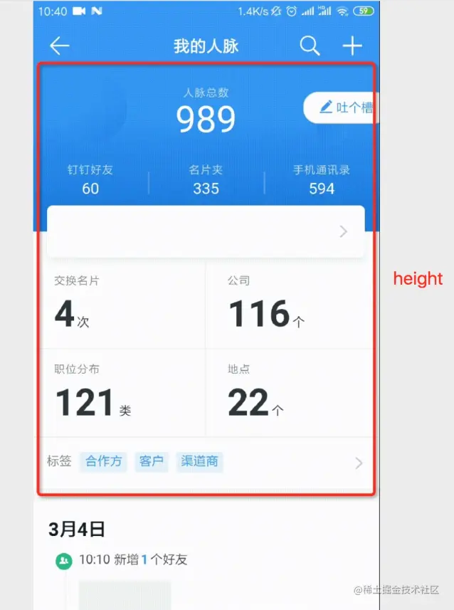 例如钉钉里的人脉首页,上半部分是相对固定的展示,而下半部分 feed 流可能每次打开都会展示不同的信息。那么在这种场景下我们就没必要每次都对整个首页第一屏进行快照,可以指定一定高度的部分进行快照,让首页的一部分实现秒出。