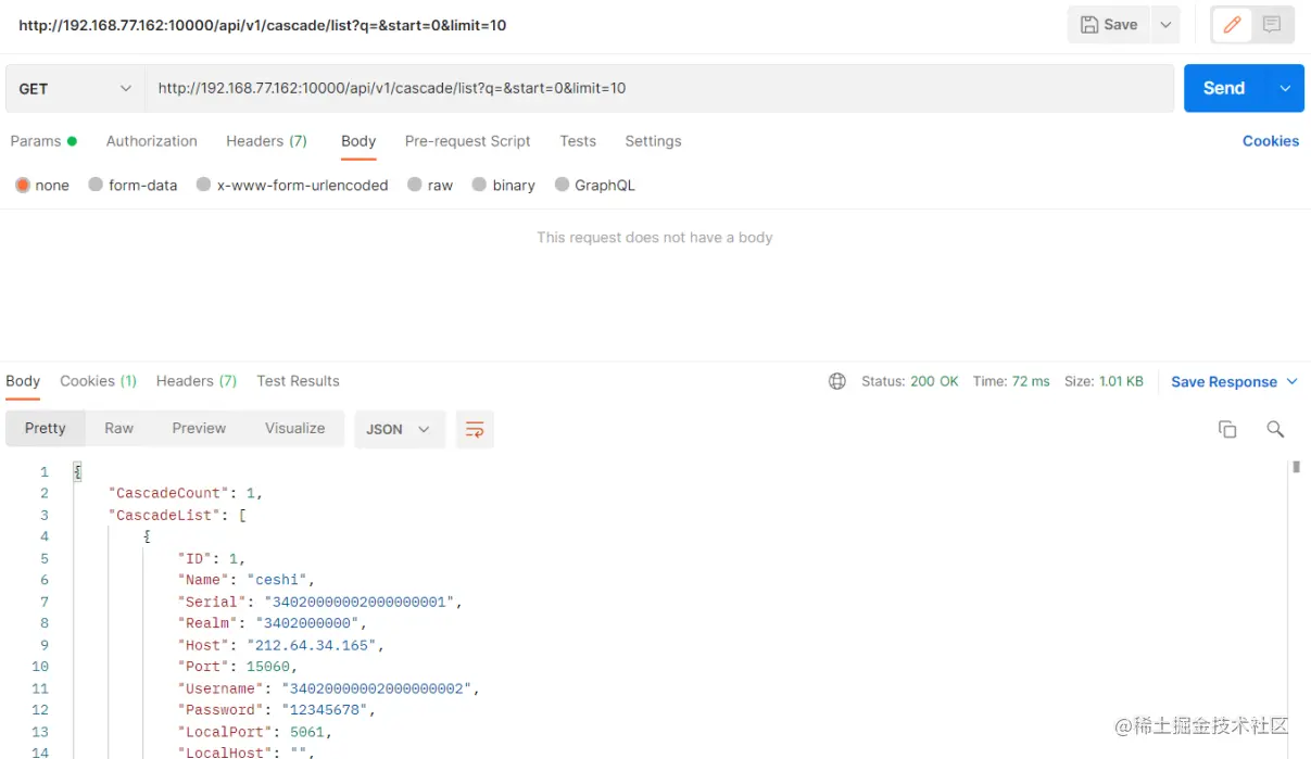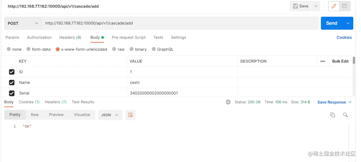 接着调用级联接口(/api/v1/cascade/add)注意这里需要用post请求,然后要写在以下标注的地方: