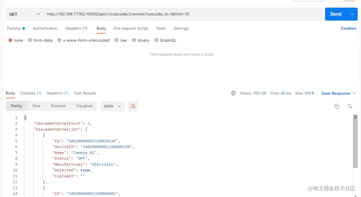 然后查询到级联的id之后将它代入到选择通道接口里面作为参数: