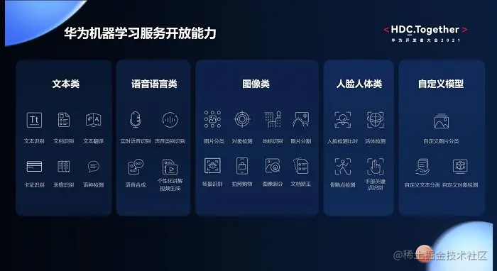 华为机器学习服务以终端设备为原点,聚焦人、车、办公等场景开放能力,包括文本类、语音语言类、图像类和人脸人体类。开发者还可以快速训练和生成自定义模型,如自定义图片分类、文本分类等。