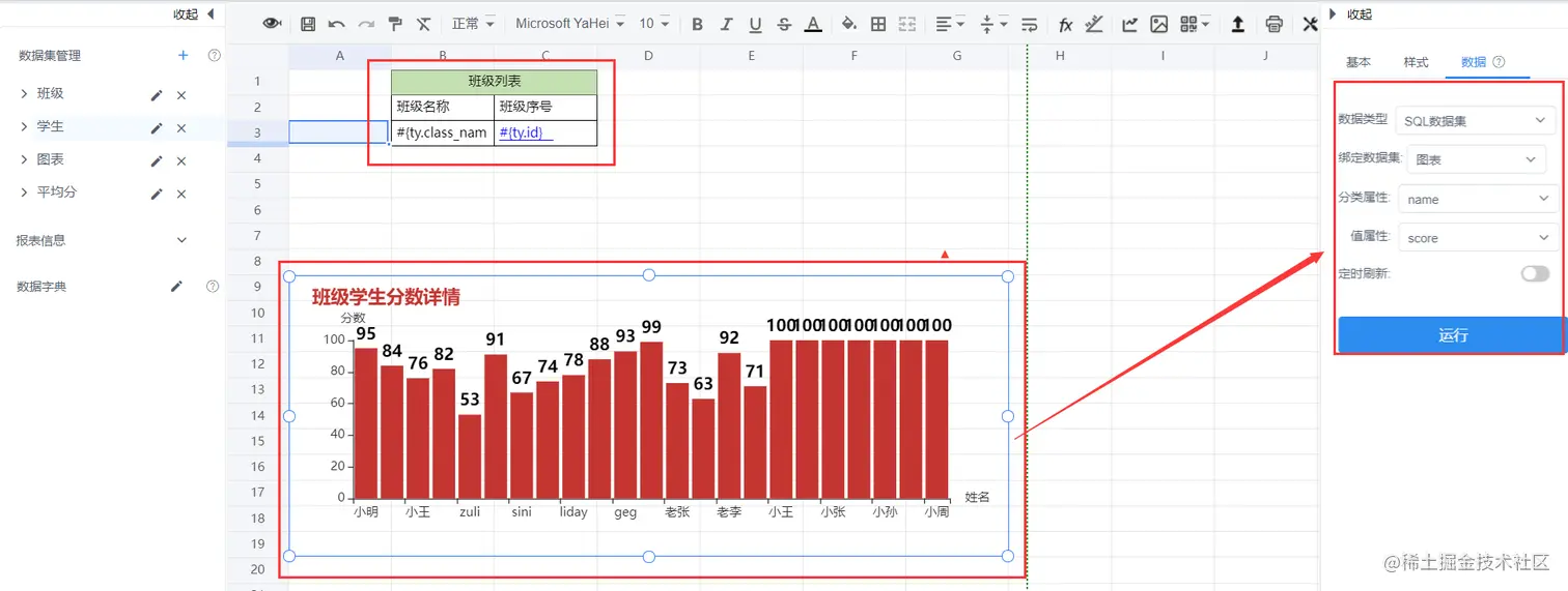 “班级学生分数图表”— 详情数据集根据班级