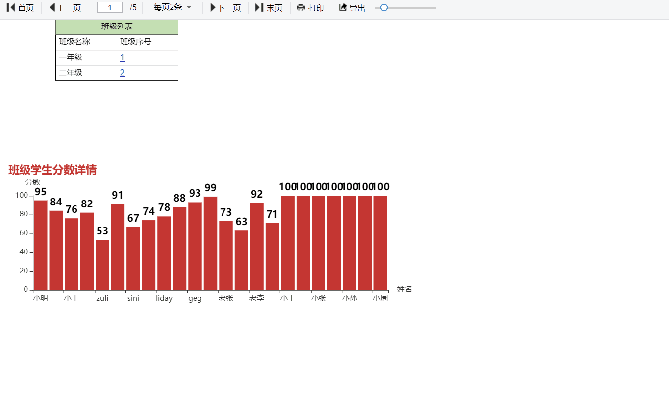 首先准备两个报表,一个数据列表 “班级列表”、一个图形报表 “班级学生分数图表”。