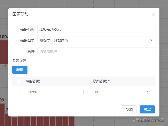 “班级列表”时通过“班级id”来联动“班级学生分数图表”,所以联动参数如下