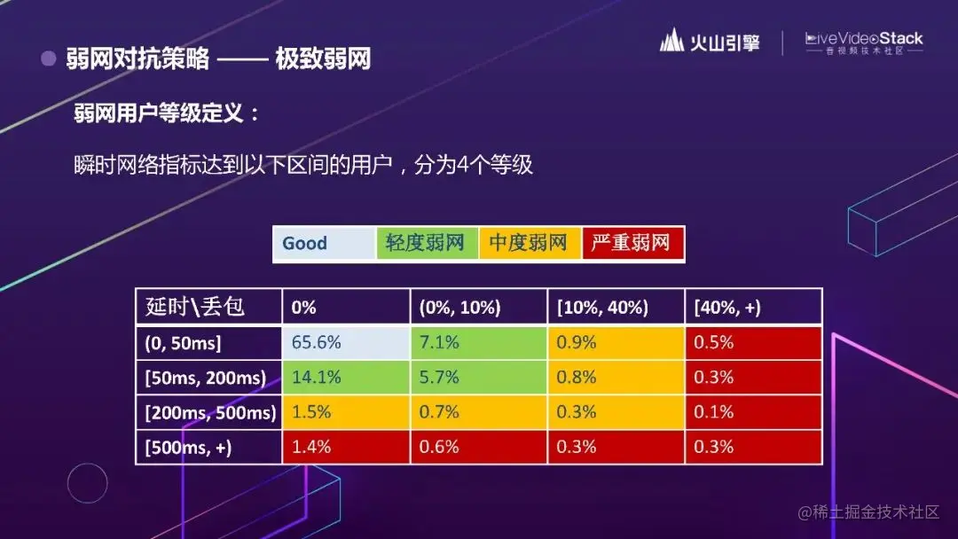 这边弱网用户等级,是按瞬时网络指标进行区分的,分为好、轻度、中度和严重4个等级。