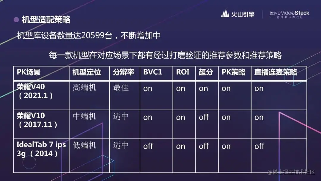 火山引擎 RTC 在后台维护了一个很大的机型数据库,设备总数达到 2w+,并且不断增加中。这边是部分截图。我们会保证每一款机型在对应场景下,都有经过打磨验证的推荐参数和推荐策略。