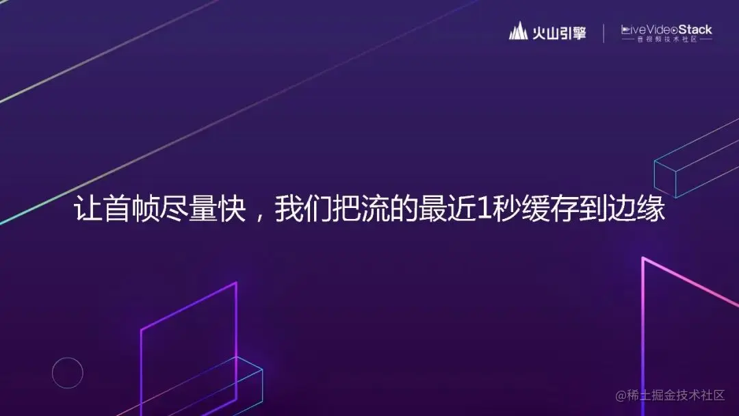 我们可以思考一下。为什么 CDN 的延时比 RTC 大很多,反而首帧响应又快更稳定?其实,CDN 会在边缘节点把命中率高的视频加入缓存,用户在拉流的时候可以从边缘节点直接拉,这样就比较快。因为业务特性的原因,RTC 不可能去做这样的缓存策略。但我们会去借鉴这样的思路。多人场景下,比如刚开始是两个人通话,后来第三个人进来,之前两个人的通话就已经在边缘节点上了。火山引擎 RTC 有一种策略是把最近 1 个 GOP 的音视频流缓存到边缘,加快新的音视频通话参与者打开首帧的速度。