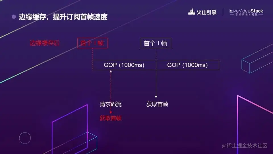 我们无法预测码流的请求什么时候来。如果没有缓存,只要不是落在 GOP 刚开始的时候,请求者就必须等到下一个 I 帧时,才能拉到首帧。很显然,这个等待时间根据 GOP 的大小有一个预期分布。而应用缓存策略之后,不管请求什么时候到,都可以即时获取到首帧。