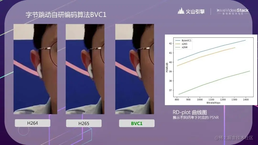 这个视频里面显示的是自研的 BVC1 编码器,和主流的 H.264 和 H.265 在编码效率的对比。右侧的 RD-plot 曲线图里显示 BVC1 编码器能比主流的 H.265 编码器再提升 0.6dB。一般我们评价一个 Codec 算法好不好,会看它节省了多少带宽。但具体到 RTC 中,用户的带宽是平稳的,分辨率也是业务上所决定的,不需要把带宽用足,把分辨率变得更高。所以火山引擎 RTC 选择在带宽和分辨率不变的情况下,把编码效率用到画质提升上。