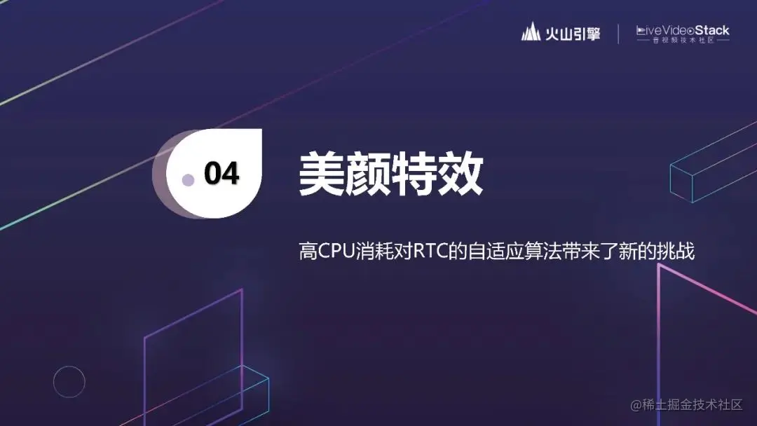 最后单独提一下 RTC 和美颜特效的结合。美颜特效其实对于 CPU 和内存的消耗是更大的,有这么大的一个模型在那边跑,对于 RTC 自适应算法带来了新的挑战。