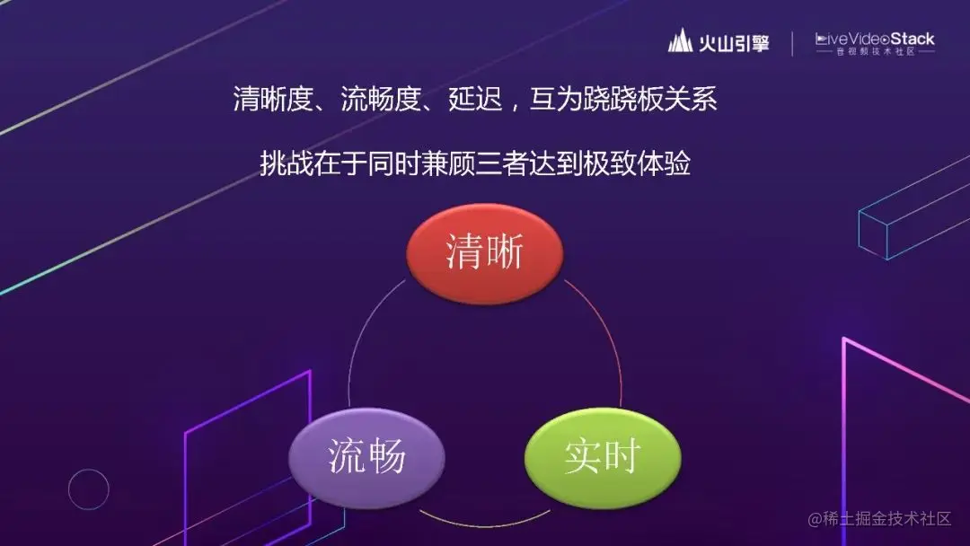 如果对 RTC 的核心指标进行归总的话,可以划分成清晰、流程、实时三个核心要求。但对 RTC 熟悉的同学都知道:这三个核心要求之间,有时是无法得兼的。网络好的时候没什么问题,网络比较差的时候,就要牺牲其中一个或两个指标。