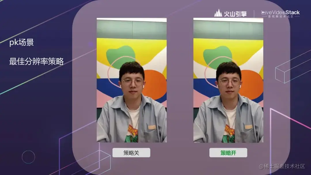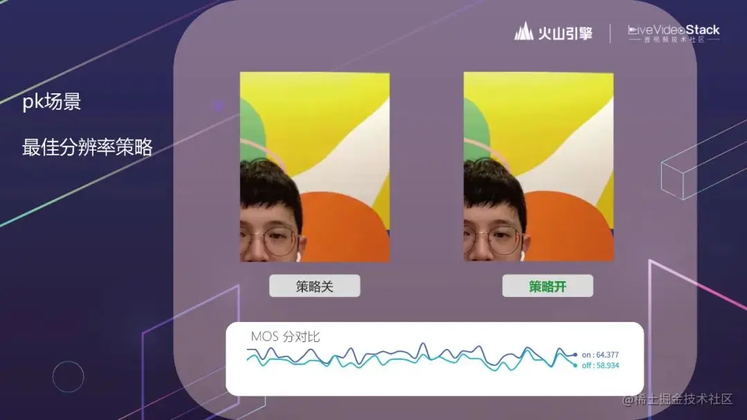 先简单介绍一下这个策略。PK 时,RTC 画面会占据画面的四分之一(长、宽各一半)。现在随着用户的手机越来越好,有些手机能支持 1080P 的音视频通话,有些只能支持 540P 等等。比如你作为一个主播,拿着 1080P 的收集和 720P 的主播进行 PK 连麦的话,其实你看到的,对面主播发过来的视频也就是 540P。对面主播采集 720P 的视频也没什么用;反过来也是一样的。最佳分辨率策略就是说,RTC 会自动根据对面主播的设备分辨率情况,来选择最合适的分辨率,而不是无脑用最高清的分辨率。