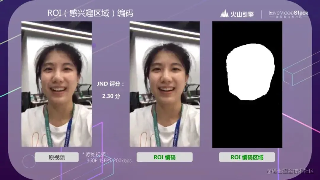 ROI(感兴趣区域)编码我们也在广泛地使用,基本上连麦场景下都会使用。用白话讲,就是针对中间的人脸进行编码。在同样的帧率和码率之下,经过 ROI 编码后的效果,在脸部细节上更清晰。正好前面有同学问到,我们怎么去评测 ROI 的效果。ISO 提供了一种通过盲测得票比率映射 JND 的方式评测画质。我们通过内测邀请了 100+ 同学对比评测,得到了 2.3 分。这是一个比较高的分数了。