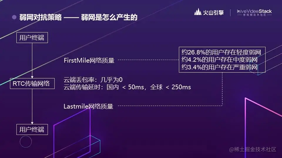 主要的弱网其实是在接入网,也是我们常说的 FirstMile 和 LastMile,也就是用户自己的客户端接入 RTC 网络的这一段。数据统计后发现,大概 30% 的用户会碰到弱网的情况,其中 26.8% 是轻度弱网,中度和重度都在4%左右。