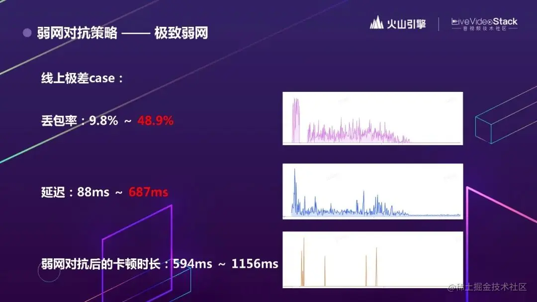 这是一个丢包率和延时参数的示意图,我们看到,最初比较平稳;突然发生弱网,持续了一段时间,丢包率最高达到了 49%。随着抗丢包策略的接入,延迟从 88ms 升到 700ms。经过优化,抗丢包策略的卡顿时长基本都控制在 1.2 秒以内。