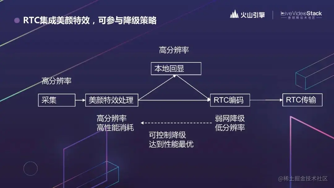 先看一下现在主流的做法,RTC 和 CV 是分开的,开发者需要先自己采集,送到美颜特效的 SDK 处理,拿到处理后的视频流,再在本地回显,并送到 RTC SDK 做编码,然后传输。这个逻辑很顺,但缺点在于, RTC 编码时会考虑弱网和设备性能的降级,如果因为弱网或设备性能不够,RTC 编码是会降级的。你想编码时候编的是一个 360P 的视频,采集和美颜用 1080P 就没什么意义,一点都不低碳。如果 RTC 的降级能够影响到采集和美颜,整体的性能消耗会更优。