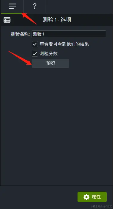 编辑好“测验”的效果后,我们可以对“测验”进行预览,看是否符合预期的效果。如图6所示,找到测验的“选项”界面,点击“预览”即可。