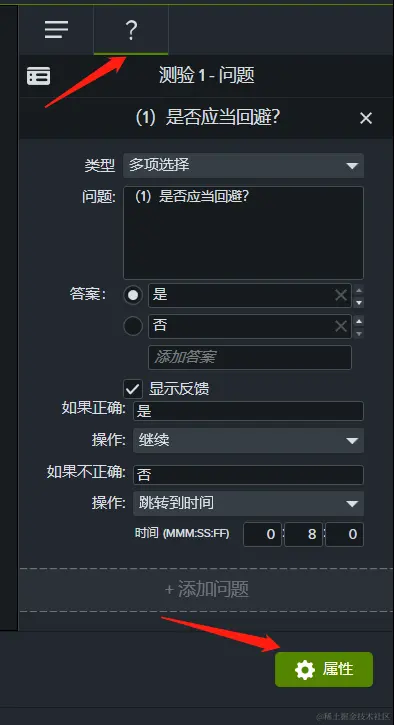 在画布的右下角,有一个绿色的“属性”按钮,点击后将会出现编辑“测验1”的界面。在这个界面里,我们可以编辑需要学生回答的问题,Camtasia还加入了显示反馈的功能,如果答对了显示正确并继续播放课程视频,答错了可以跳转到之前讲解的位置,让学生再进行回顾。